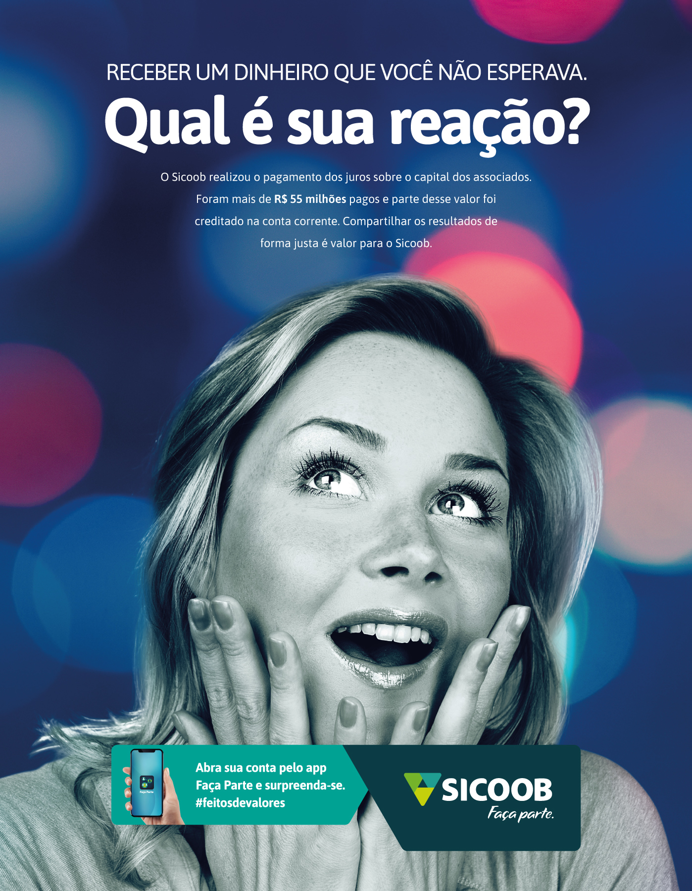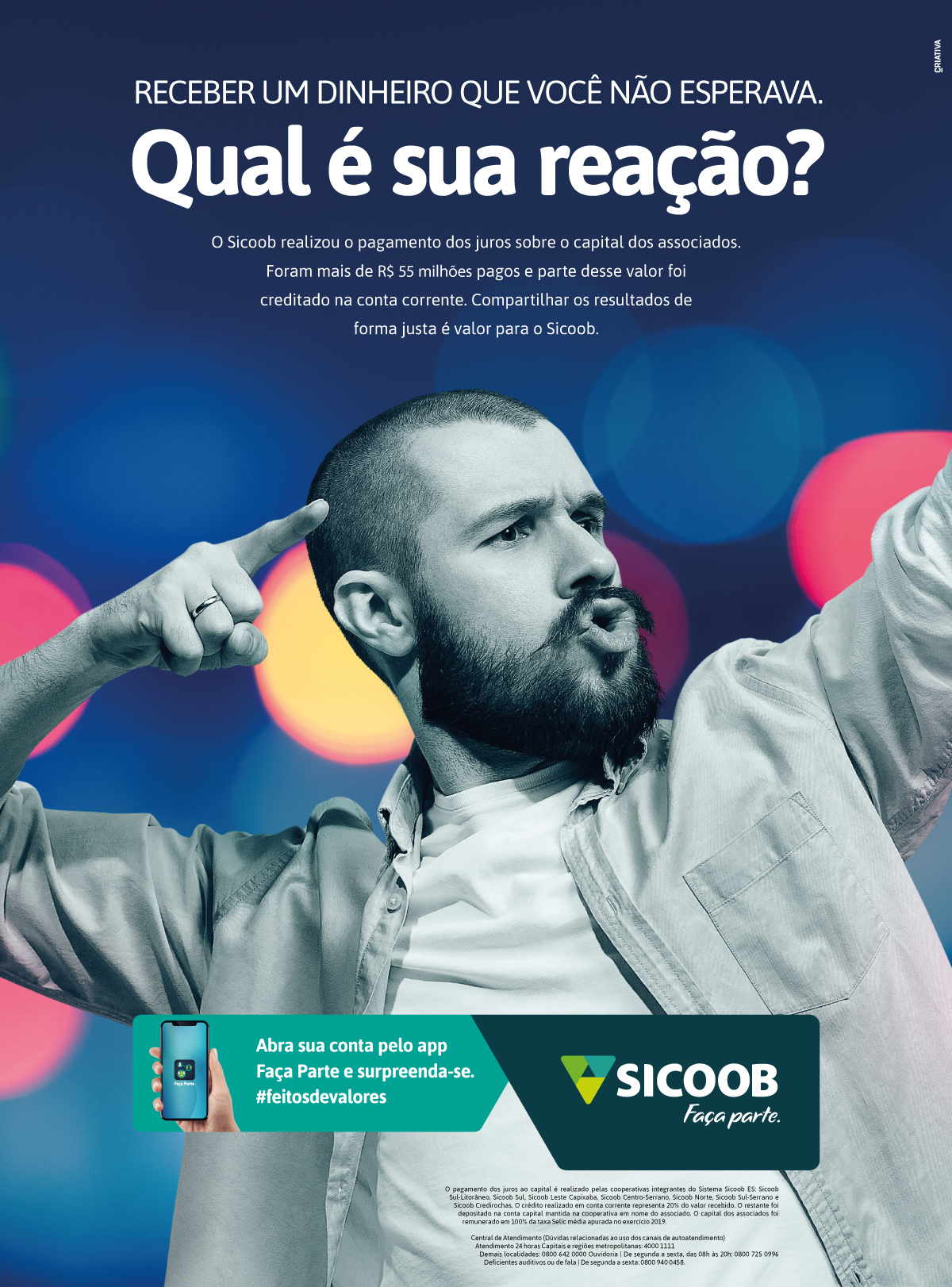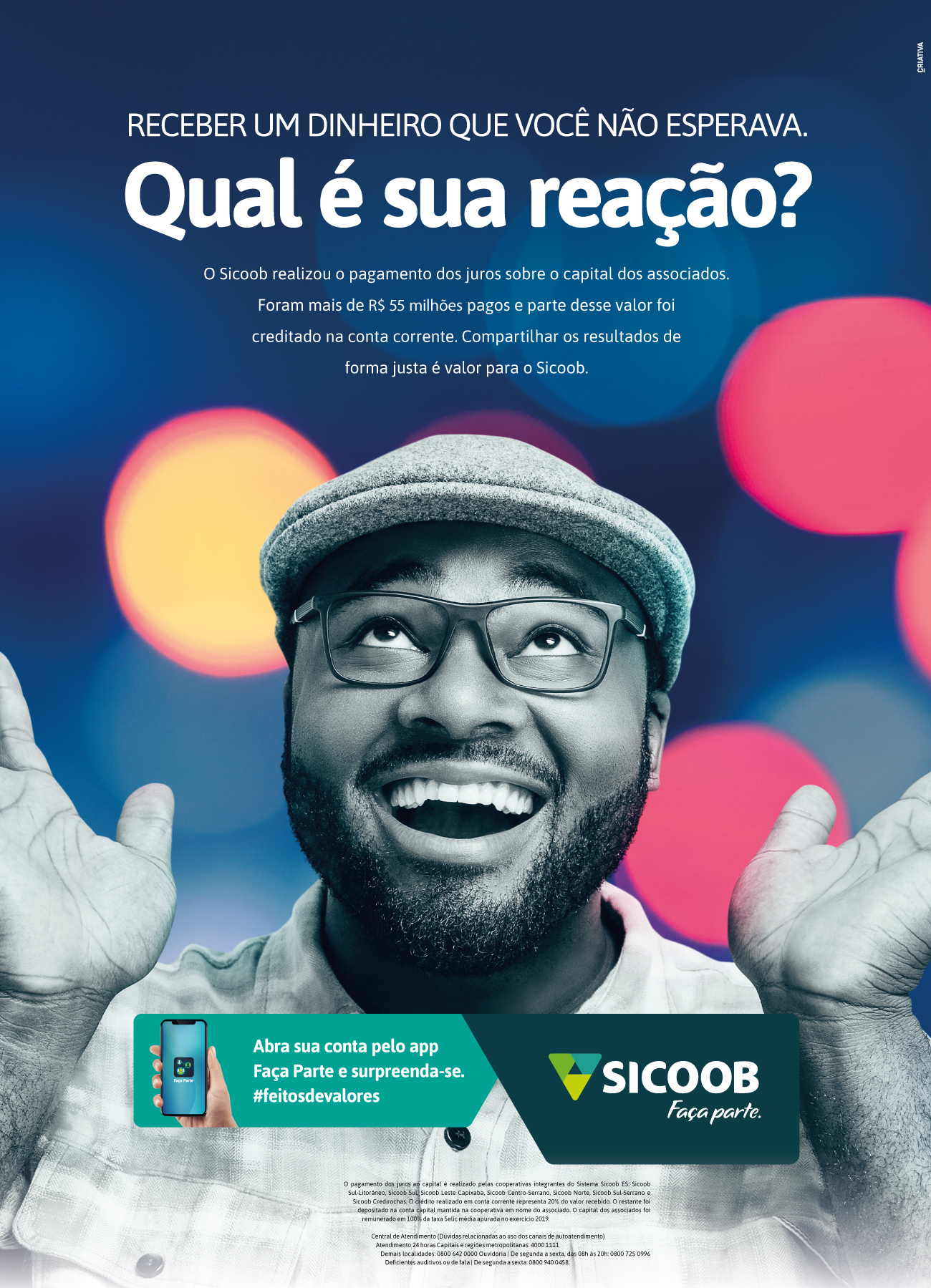 Você já encontrou dinheiro no bolso da calça que você nem sabia que tinha? Qual foi a sua reação? Com esse mote, a campanha de Sicoob informou que o pagamento dos juros ao capital haveria de ser realizado para todos os associados no fim do ano.